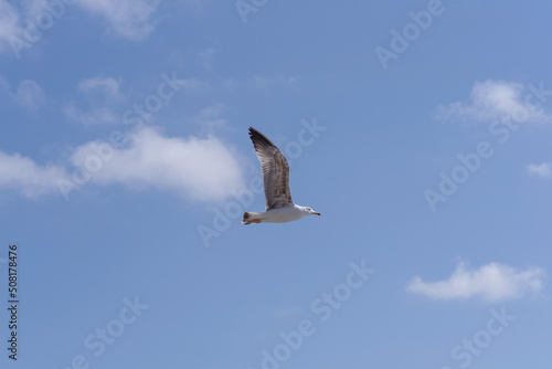 Fototapeta premium An young Yellow-legged seagull flying over a blue sky