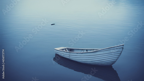 Naklejka premium Analog style boat in a lake. Tranquil Waters. A Solitary Journey on a Blue...