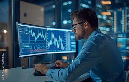 Obraz premium Analyst employs a computer, technology, business analysis, and data.