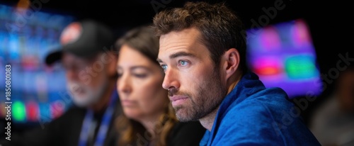 © ckybe, Obraz premium Analysts examining game stats prior to live broadcast commentary session.