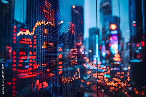© Zyariss, Obraz premium Analyzing Financial Data Displayed on a Screen with Cityscape Reflections