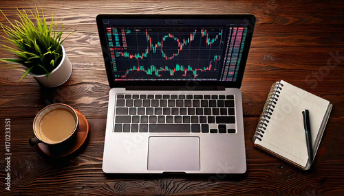 Fototapeta premium Analyzing stock market trends home office digital workspace cozy environment top-down view