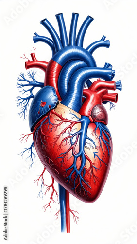 Naklejka premium Anatomical illustration of human heart in red and blue with arterial and venous structure