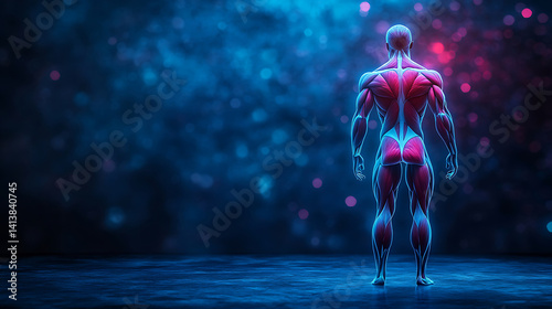 © BgStudio98, Obraz premium Anatomical Illustration Of Human Muscle Structure And Tissue Showing Muscular System With Pink And Blue Glow,Back View,On Dark Abstract Background
