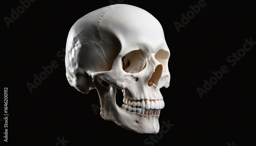 © studioforty3, Naklejka premium Anatomical Study of a Human Skull with Teeth and Jaw Bones on a Black Background