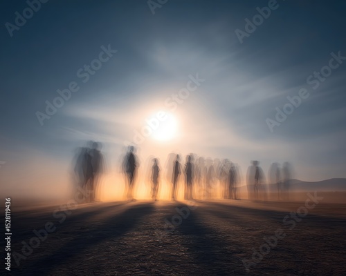 © Warawut Khueanpet, Obraz premium Ancestral Spirit Gathering during full moon in a desert, spiritual silhouettes performing ancient ritual, taken using long exposure with pro tripod setup