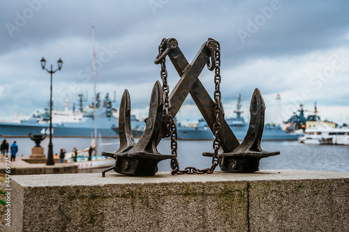 Fototapeta premium Anchor in Kronstadt on the embankment, a symbol of the city.
