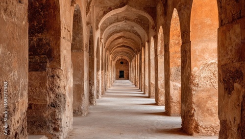 © Iga, Obraz premium Ancient arched corridor, warm light
