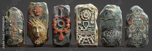 Fototapeta premium Ancient Artifacts of Wisdom: A collection of carved stones, each bearing intricate symbols and designs.