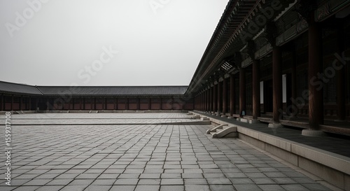 © Fujika Studio, Fototapeta premium Ancient Asian Architecture Courtyard Stone Pavement Wooden Columns Traditional Building