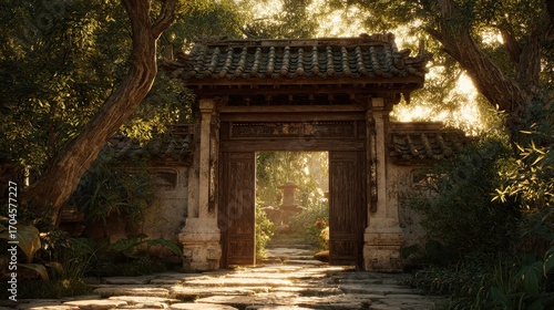 © Aura, Obraz premium Ancient Asian Gateway Illuminated by Golden Sunbeams in a Serene Forest.