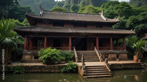 Fototapeta premium Ancient Asian temple by water, lush greenery.