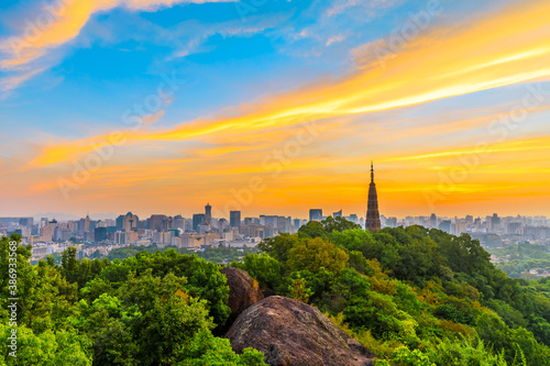 © ABCDstock, Fototapeta premium Ancient Baochu Pagoda.Chinese traditional architecture and modern city skyline in Hangzhou at sunrise,China.