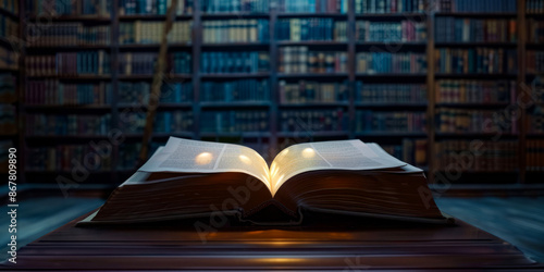 Fototapeta premium Ancient Book in a Mystical Library with Glowing Lights