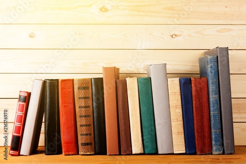 © BillionPhotos.com, Naklejka premium Ancient books in a row on wooden