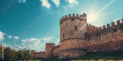 Fototapeta premium Ancient brick fortress walls with sky backdrop, city architecture, leisure...