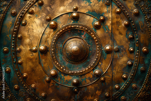 © Maria A, Naklejka premium Ancient bronze artifact with golden texture and intricate patterns on a worn, abstract surface, highlighting detailed craftsmanship