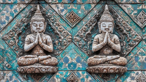 © BOJOShop, Fototapeta premium Ancient Buddhist Statues Carved into Wall with Turquoise Tiles