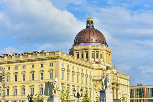 © B.inna, Obraz premium Ancient building with yellow walls, tall windows and a large brown dome on the background of blue sky. Historical architecture and statues. Germany, Berlin, August 2022.