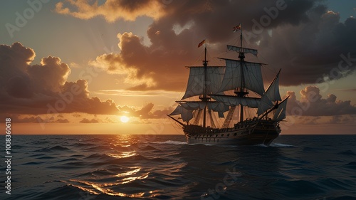 © R-CHUN, Obraz premium Ancient carrack sailing ship navigating calm ocean at sunset.