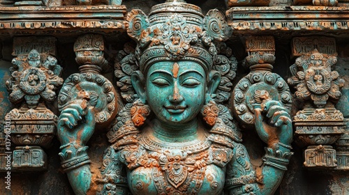 © SAQUEEN, Fototapeta premium Ancient carved deity, intricate details