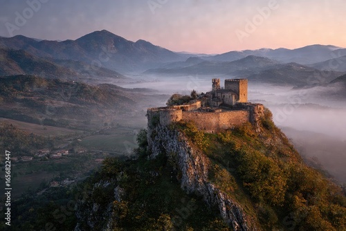 © pedro, Obraz premium Ancient castle perched on a misty mountaintop