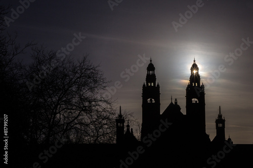 Obraz premium Ancient castle silhouette with sun through one tower.