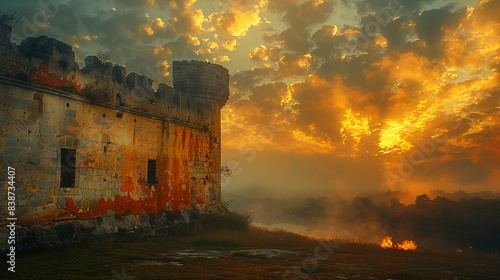 Fototapeta premium Ancient castle, sun rising behind walls, interplay of shadows and light