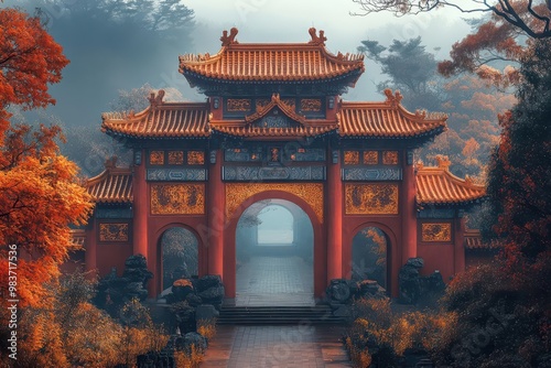 © Vesna, Fototapeta premium ancient chinese imperial palace ornate golden gates misty mountaintop setting ethereal light mystical atmosphere traditional architecture