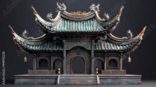 © Woranittha, Naklejka premium Ancient Chinese pagoda, detailed roof tiles, and dragon motifs, 3D model