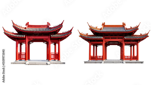 © wanna, Fototapeta premium Ancient Chinese temple architecture stands out with its traditional roof on a white background.