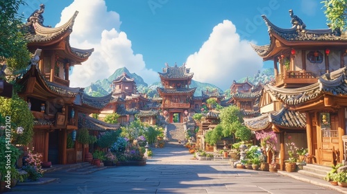 Fototapeta premium Ancient Chinese Village Street with Traditional Architecture, Stone Pathway,...