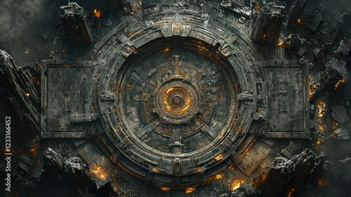 © mlangsen, Fototapeta premium Ancient circular portal amid fiery ruins, aerial view, potential energy source