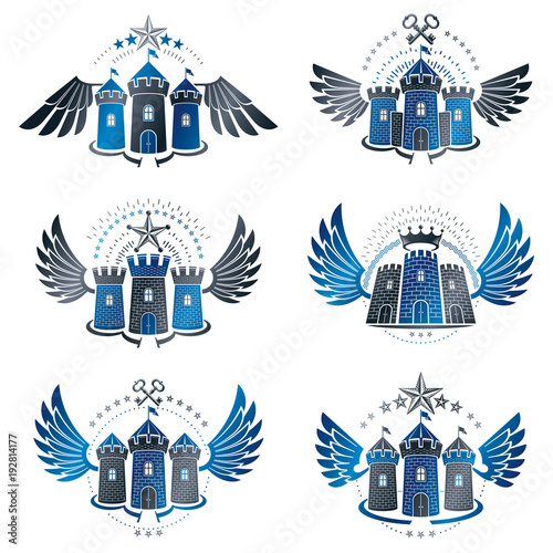 Fototapeta premium Ancient Citadels emblems set. Heraldic vector design elements collection....