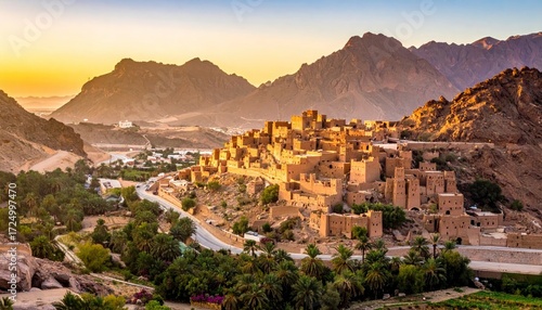 Obraz premium Ancient City nestled in Mountain Valley at Sunrise.