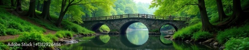 © Wasapol, Fototapeta premium Ancient clapper bridge over Barle River, lush green woodland, greenery, footpath