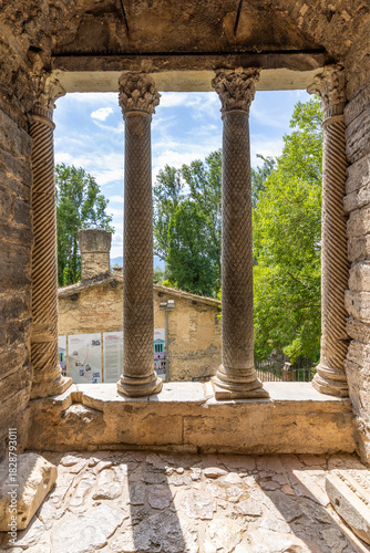 © Richard Semik, Fototapeta premium Ancient columns framing view of Tempietto sul Clitunno, Umbria