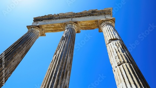 Naklejka premium Ancient columns rise against a clear blue sky, showcasing classical...