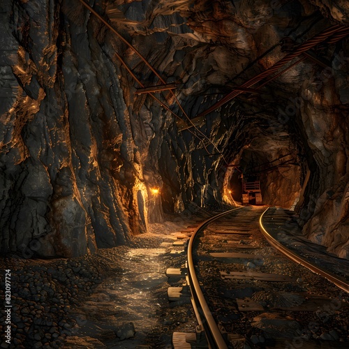 © gdgaffar, Naklejka premium Ancient Deserted Gold Mine. within a deserted gold mine that has ore cart tracks. Generative AI