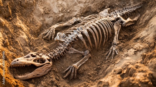 Fototapeta premium Ancient dinosaur skeleton: Fossilized remains partially buried in the earth,...