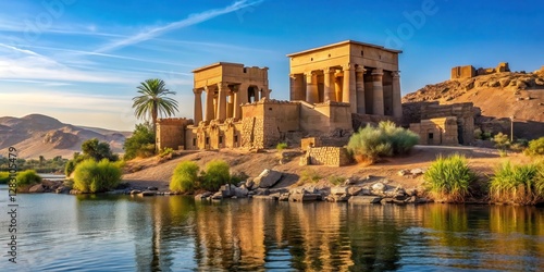 Fototapeta premium Ancient Egyptian temple ruins on the Nile River in Aswan, Egypt, desert landscape