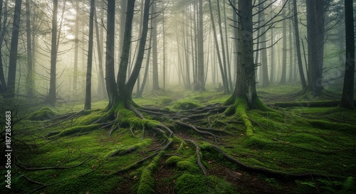 © Yana, Obraz premium Ancient Forest Floor with Gnarled Roots and Moss