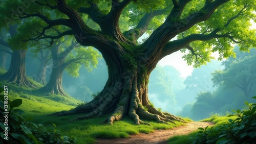 © Kritsana, Naklejka premium Ancient Forest Path Leading to a Majestic Tree with Lush Greenery and a Misty Atmosphere