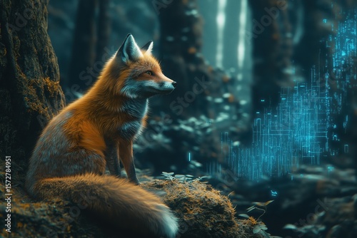 © Maria, Naklejka premium Ancient Forest Slowly Submerged by Glowing Blue Circuitry and Digital Rivers