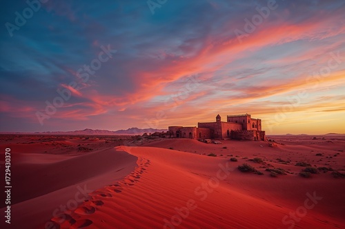© pngking, Obraz premium Ancient fortress at a desert oasis surrounded by vibrant colors and natural beauty