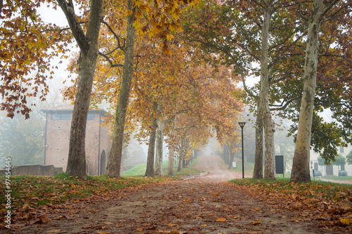 Obraz premium Ancient fortress beside a path between two roxs of tree with yellow leaves in a foggy autumn morning - Ferrara, Italy