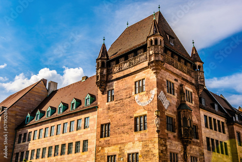 © Ievgen Skrypko, Fototapeta premium Ancient fortress facade in old city center in Nuremberg, Germany. Historical house exterior in Bavaria, Europe