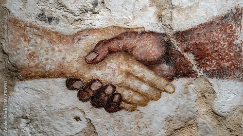 © Plankton, Naklejka premium Ancient fresco depicting two hands shaking, set against a stone wall.