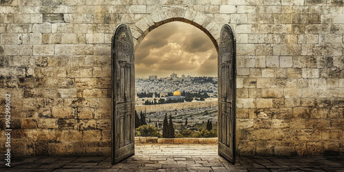 © Светлана Воротняк, Fototapeta premium Ancient gate, arch entrance in brick wall with view of ancient city. Entrance to Jerusalem