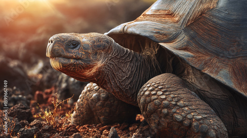 © Jacks Studio, Obraz premium Ancient Giant Tortoise Portrait Showing Textured Shell and Weathered Skin